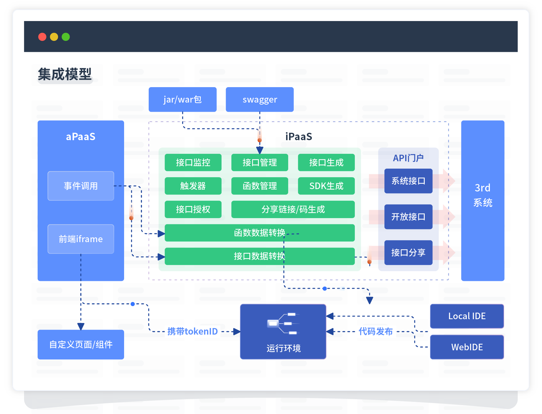 集成模型包括平台本身前、、、、后端能力的扩展,,,,也支持通过API门户和第三方系统进行交互。。。。。。。。。。。。