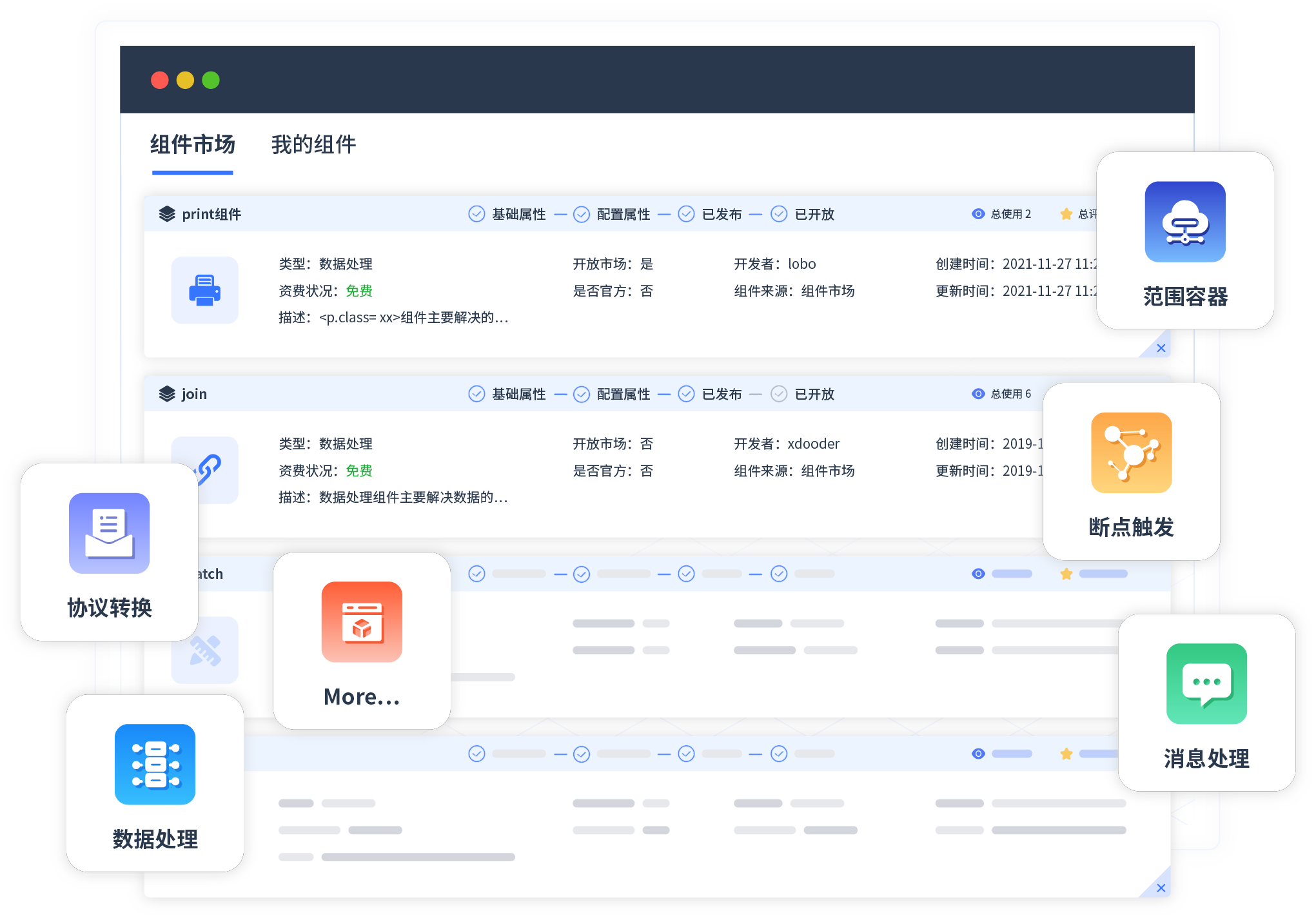 针对集成场景,,,,,,,,OPPO钱包提供组件市场,,,,,,,,,,,,例如协议转换、、、、、消息处理、、、、、、、、、文件操作等。。。。。。。。。。。。除平台提供的组件外,,,,,,客户可以自定义所需组件。。。。。。。。