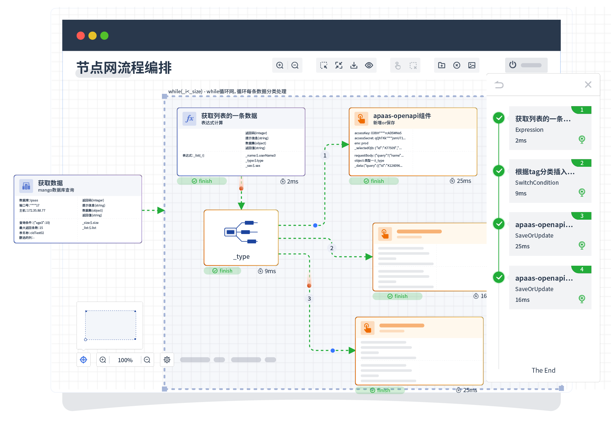 针对集成场景,,,,,组件定义后支持进行流程编制,,,,,不同于传统代码方式,,,,,通过图形化展示,,,,,,,支持在线调试、、、、、、、、、、日志查看和运行回放。。。。。。。。。。。。。。
